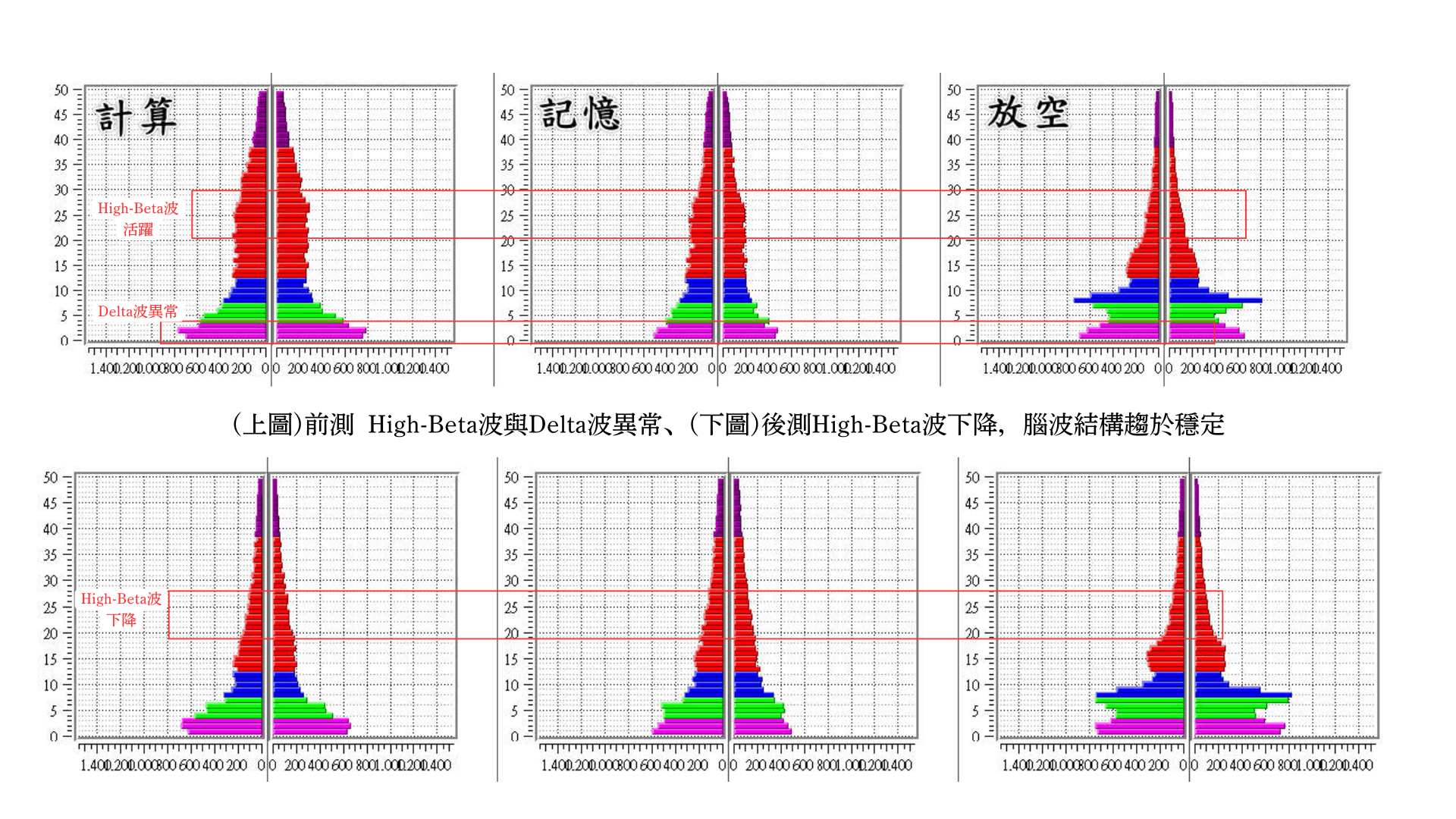 後測腦波圖:腦波對稱度提升,High-Beta波下降,放鬆波段增加。
