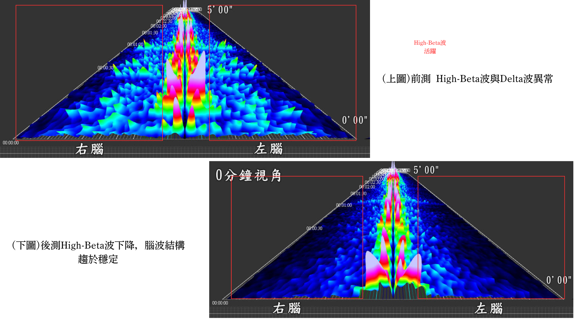 後測腦波圖:High-Beta波下降,腦波結構趨於穩定,情緒控制力提升,人際互動品質改善。
