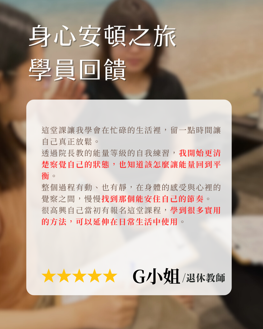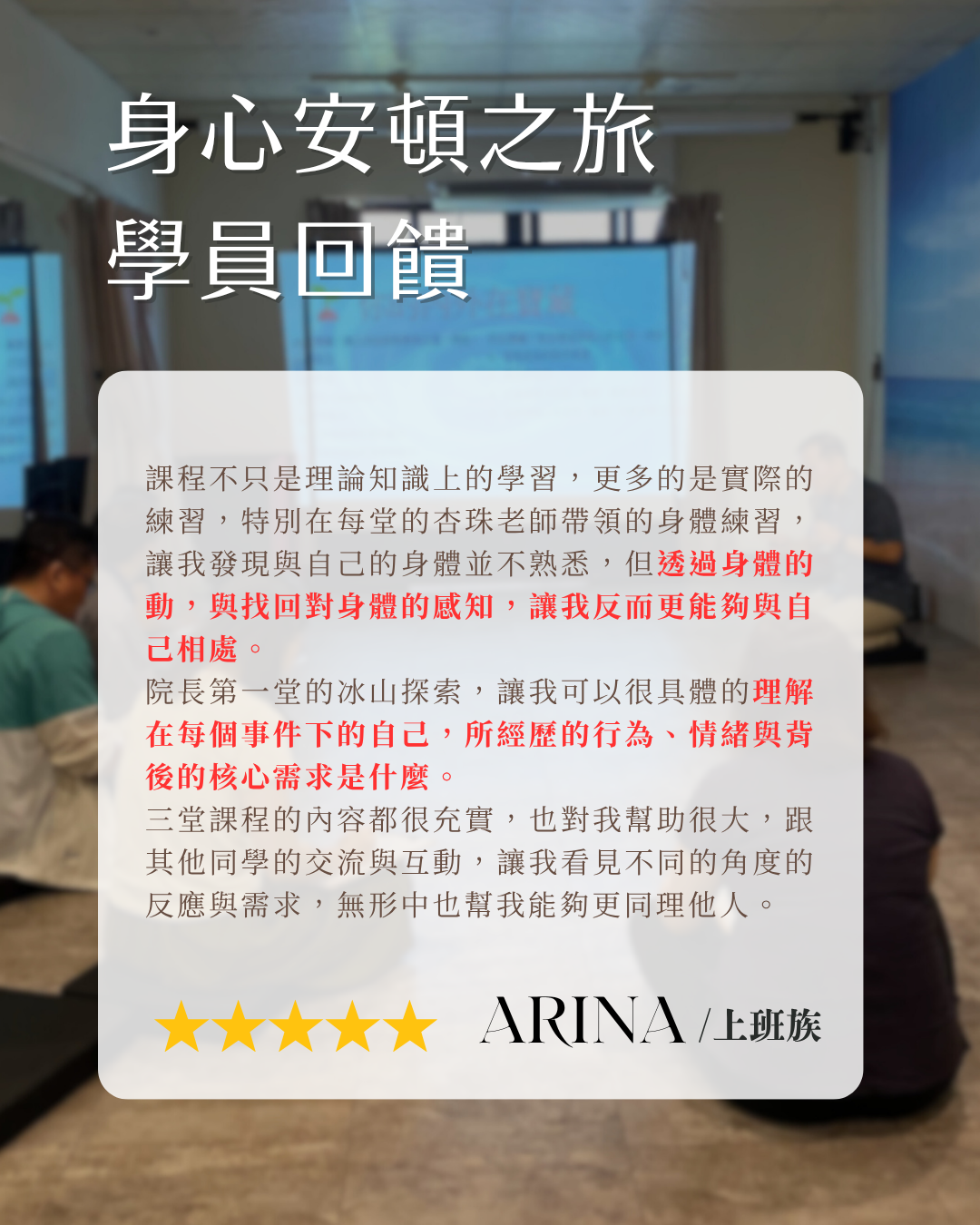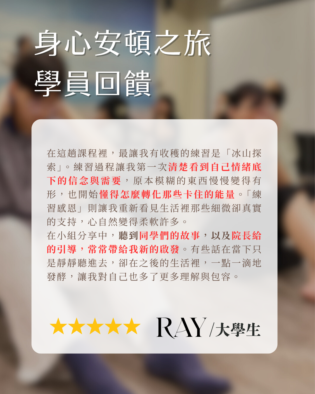 每梯次僅限至多15位,我們特別重視安全感與陪伴品質,讓每位學員都能被照顧。