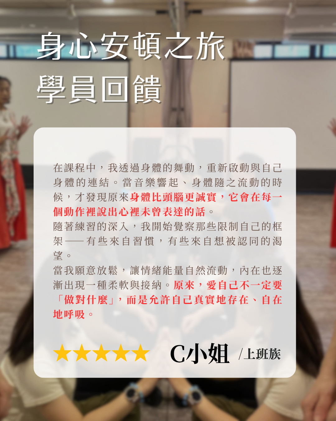 我引導的不是標準舞步,而是一段段回到自己身體的旅程。